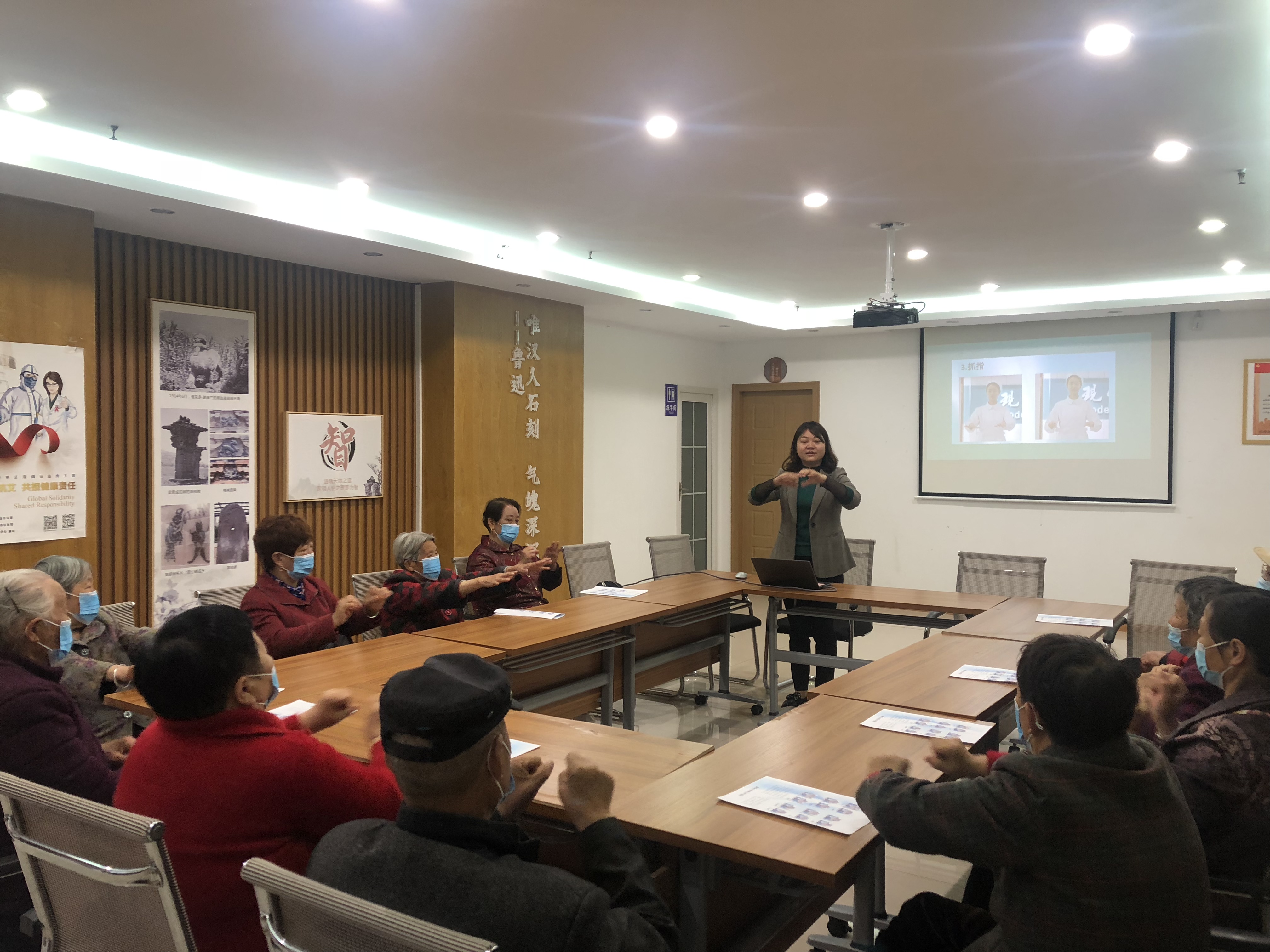 任冬梅老师主要分享了老年人饮食、用药照护要点、预防老年人跌倒、预防老年人痴呆等相关知识,列举了大量的实例,指出了生活中普遍存在的一些误区,提出了合理的养生和保健建议,提倡合理膳食,适量运动,戒烟限酒等健康生活方式。同时,任老师还带领大家一起做了预防老年痴呆的手指操,她从手指操原理、预防作用,具体操作步骤等几个方面进行了详细讲解,内容生动有趣,操作性强,讲解生动易懂,参会的居民们很快的掌握了这些基本日常护理技能,大家纷纷表示受益匪浅。