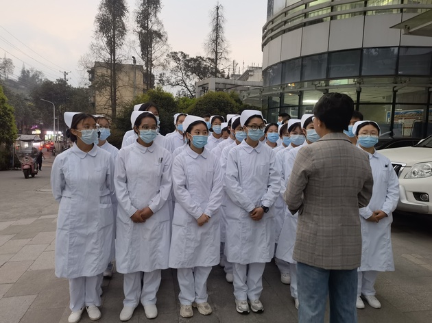 当日上午八点,在太阳集团tyc33455廖林梅老师的带领下,同学们穿戴整齐到达市医院行政楼下集合。市医院护理部副主任周昀霞对公司老师及订单班员工的到来表示了热烈的欢迎,对医院的情况做了详细的介绍,并就临床学习中着装规范、人身财产安全、职业防护等内容提出了要求,最后希望同学们能认真学习,尊敬师长,勤学善思,尽快融入。随后,订单班的成员进行了人员编排,分别进入各个科室。