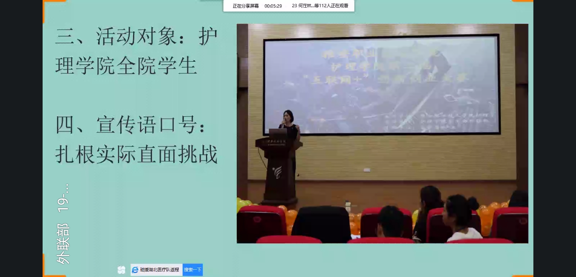 本次活动分为视频案例观摩、创新创业政策讲解、线上交流三个环节。主持人首先就活动主题及流程进行介绍,播放专题视频,结合高校创新创业的特点、模式等和同学们进行分享各交流。叶芋伶老师从本次新冠肺炎疫情出发,分别从双创教育的目的、意义,创业项目挖掘、备赛及参赛流程和注意事项等方面与同学们进行了深入交流,并对同学们反馈的问题进行了耐心细致的解答。