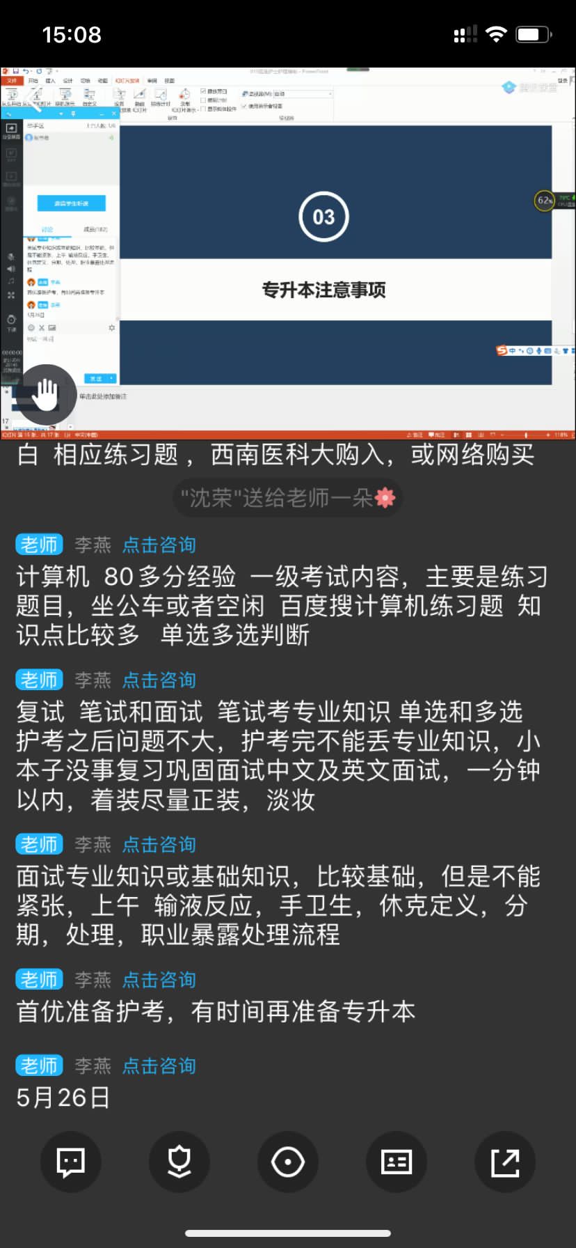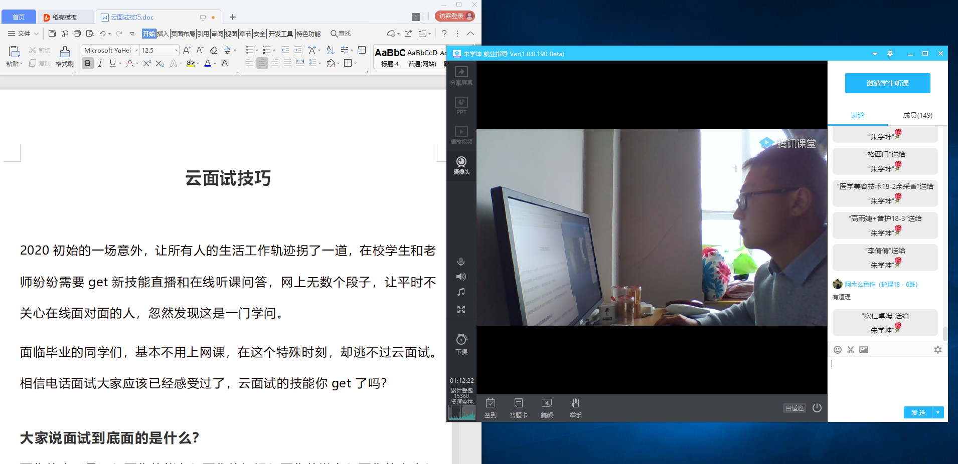 3月31日下午,由李燕、叶芋伶、朱学坤、沈丛微主讲的“专升本政策指导与经验分享”、“求职心理调适与就业信息获取”、“云面试技巧”、“简历诊断及指导”4场讲座在腾讯课堂顺利开展,500余名同学通过网络进行了学习。讲座结束后,同学们积极申请加入专题就业指导交流群,继续就求职、升学中存在的问题和老师进行深入讨论和交流。