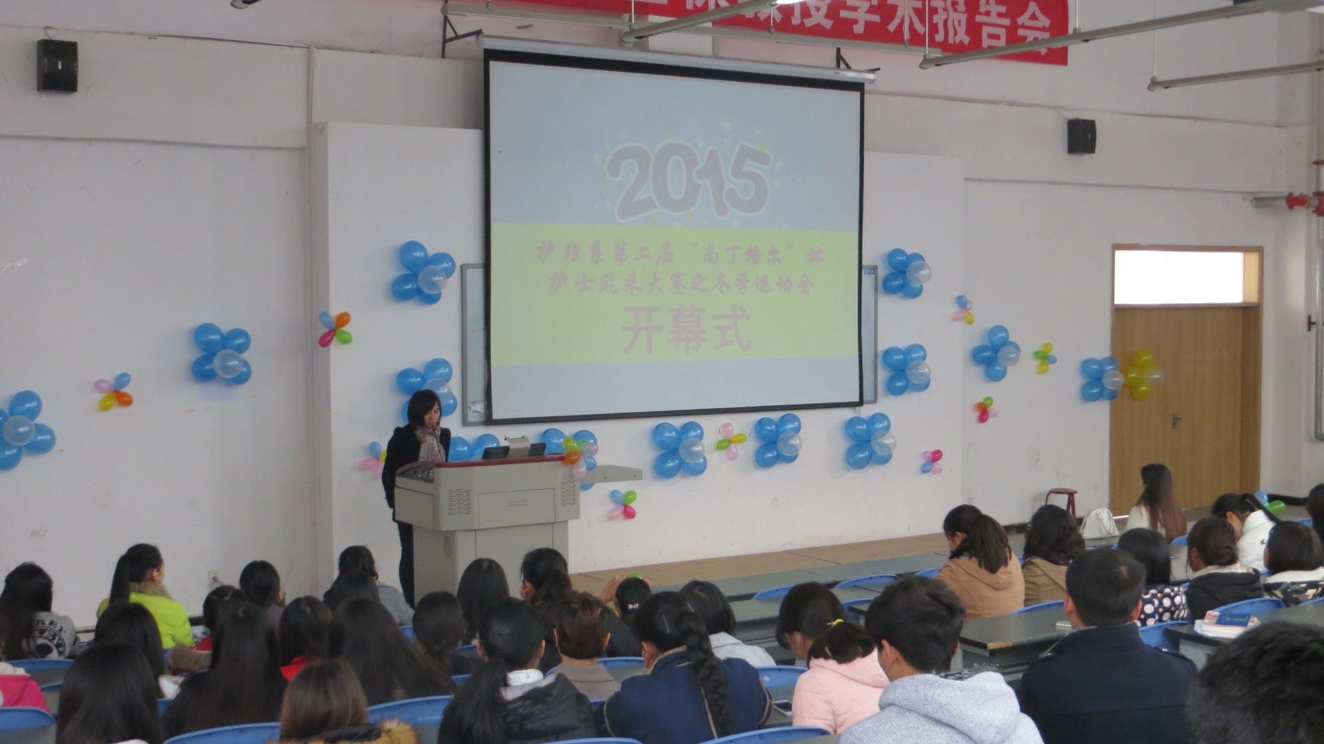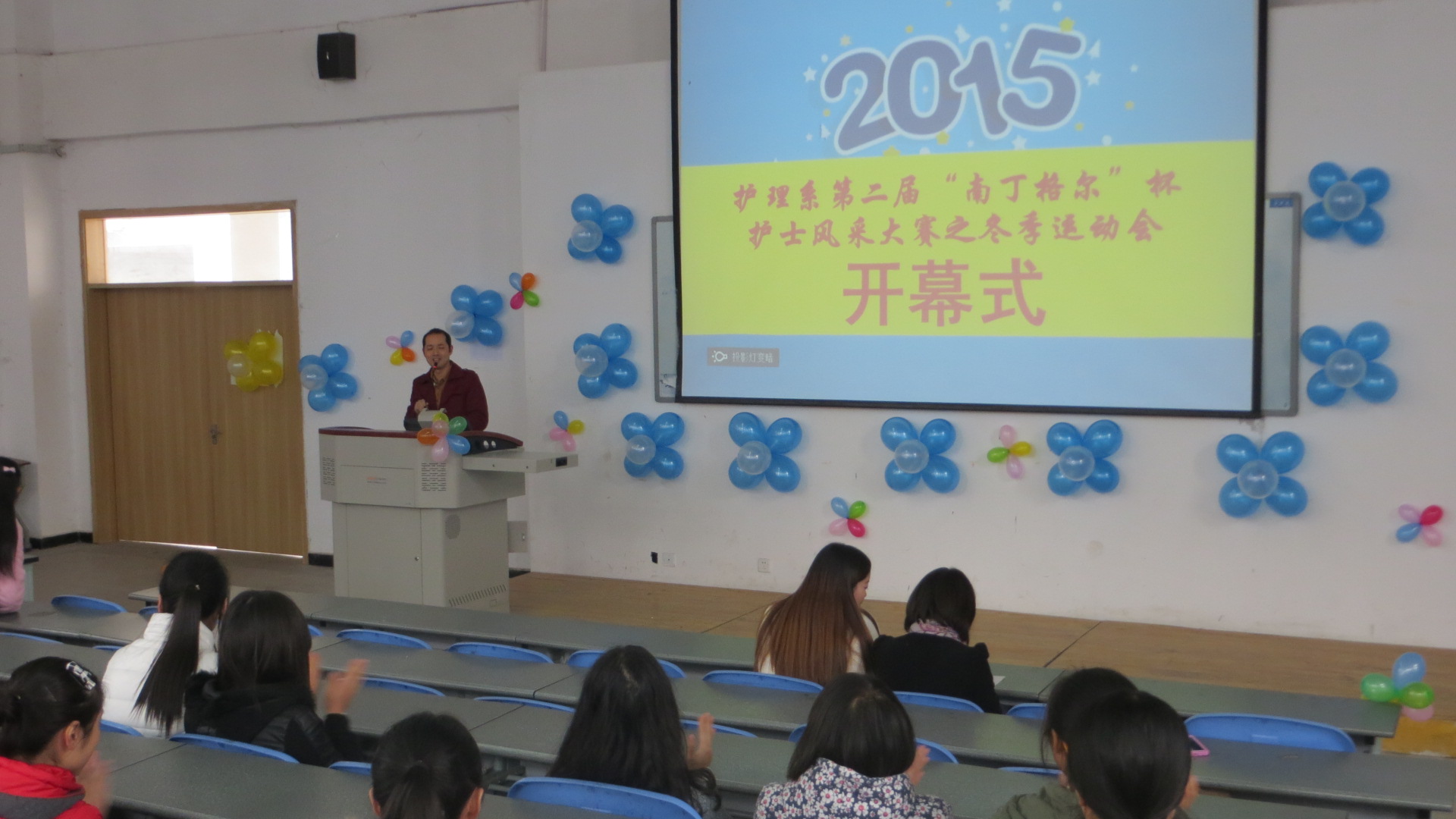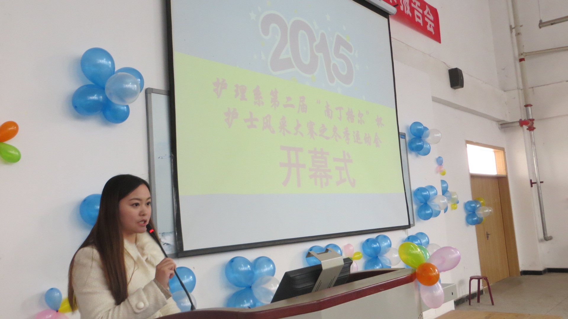 吴玉阳老师简要介绍了比赛项目的基本情况,给予了在场选手殷切的希望与热烈的祝福。万黎老师在发言中强调了开展运动会对提高员工的健康意识、强身健体的意义。运动员代表及裁判员代表宣誓后,郭英才书记上台致辞,他向参加开幕式的大一新生介绍了开展“南丁格尔杯”护士风采大赛的目的、意义,希望大家积极参与各项活动,特别是要重视加强体育锻炼,发扬不断超越自我的体育精神,最后郭英才宣布“南丁格尔”杯护士风采大赛之冬季运动会正式开幕,并预祝各位选手赛出水平 、赛出风格、赛出好成绩!