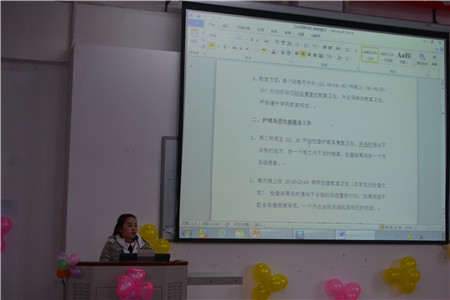 1月7日14:30,由护理系主办的第二届“南丁格尔”杯护士风采大赛之寝室文化设计大赛暨优秀寝室颁奖典礼在青年路校区图阶101教室隆重举行。出席此次典礼的嘉宾有:护理系主任王静、副主任廖书娟、党支部副书记李敏、团总支书记万黎、副书记陈静,辅导员李扬、饶玲、邓蓓、陈蕾、唐佳、高佳慈等多位老师。