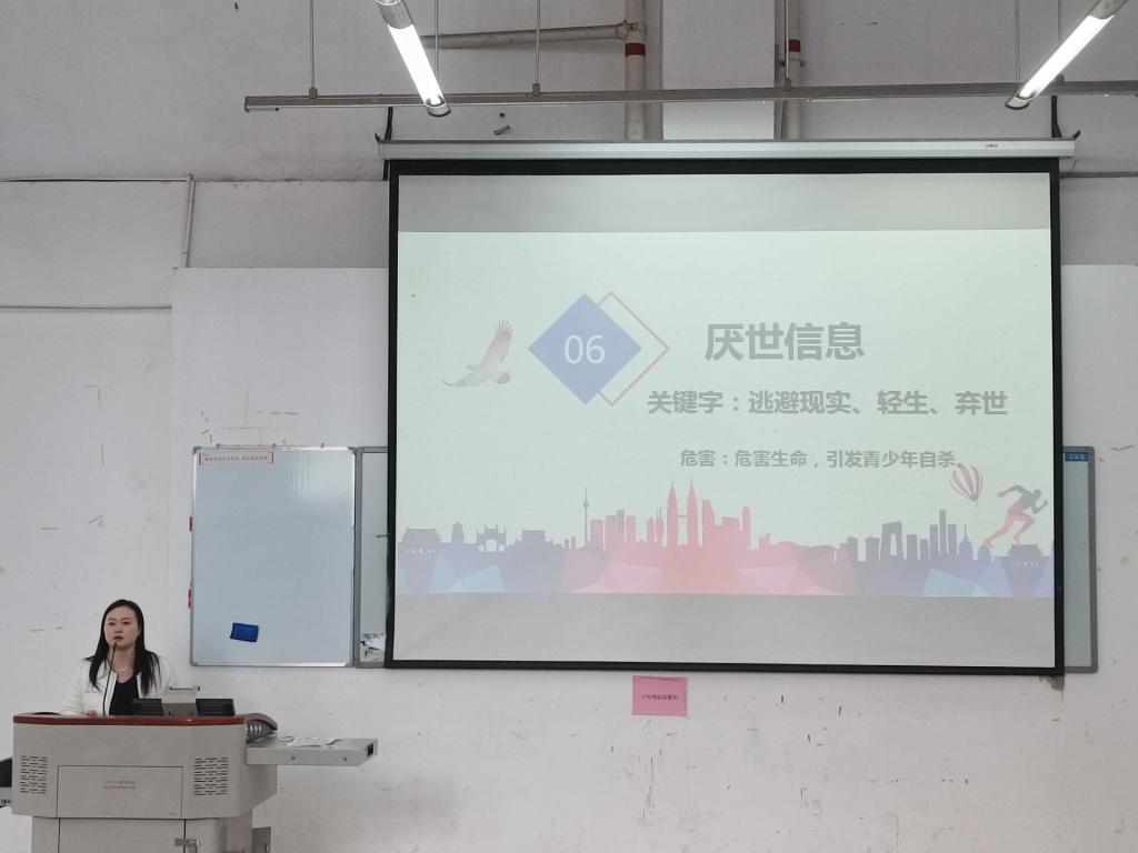 吴玉阳从分析预防不良信息的侵权问题方面出发进行讲解,提升同学们对不良信息的认识,普及如何安全上网,警示同学们自觉遵守网络安全相关规定,避免上网行为不当引起自身和他人利益损失。同时结合具体事例阐述了网瘾的危害,呼吁同学们拒绝网瘾,健康上网。