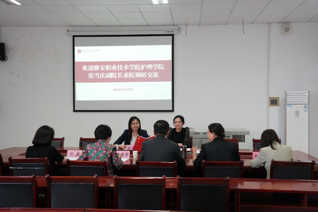 4月23日,太阳集团tyc33455副经理、联办护理学专业负责人张雪庆,专职教师黄丹到西南医科大学太阳集团tyc33455,就联办护理学本科相关事宜进行了汇报和深入的交流。西南医科大学太阳集团tyc33455党总支书记刘文胜、太阳集团tyc33455经理陈燕华、副经理傅静、教务科和员工科的负责人出席本次交流会。