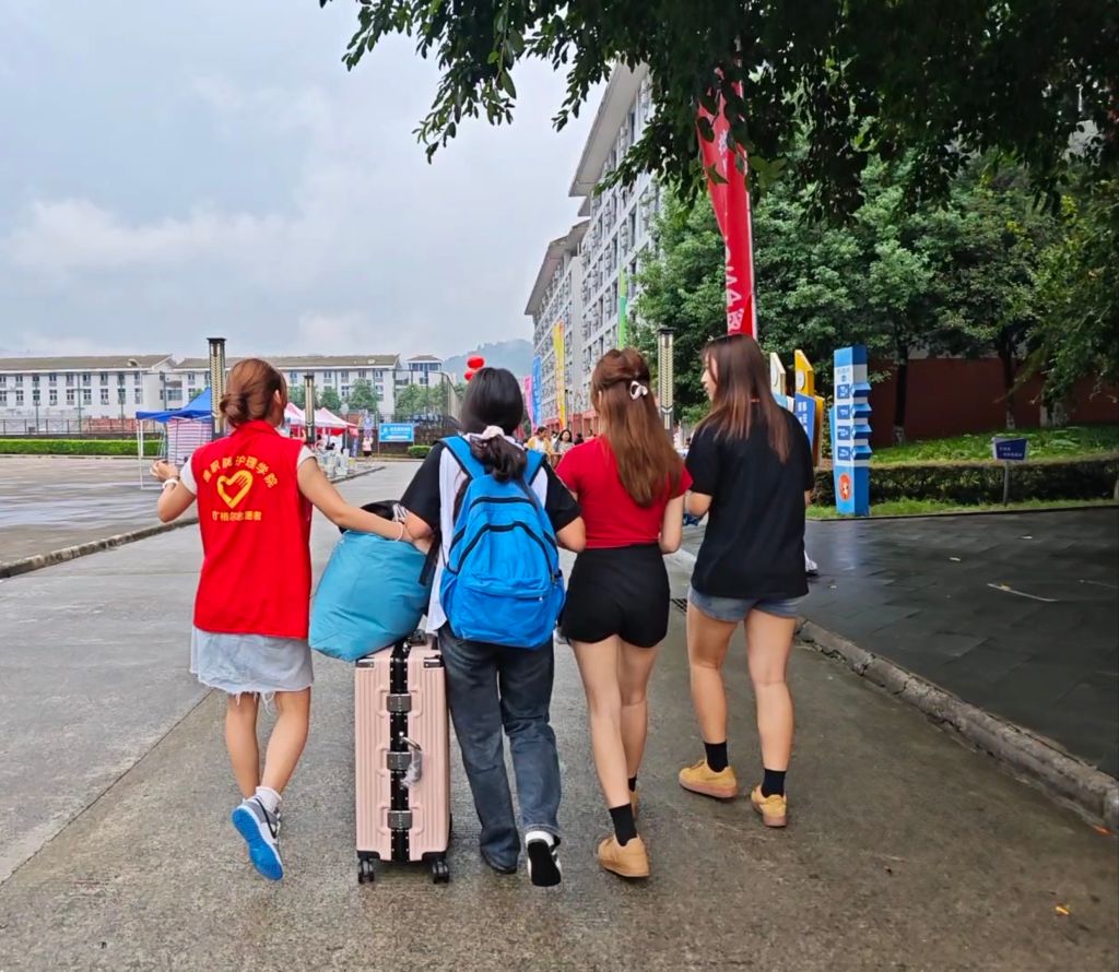 迎新过程中,志愿者们积极主动,用热情真诚的态度对待每一位新同学。“同学,让我来帮你搬行李吧,你只需要跟着我,我带你去你的宿舍。”志愿者的话语如同一缕和煦的春风,瞬间消除了新生的不安与迷茫。在报到处,老师们用最温暖的笑容迎接每一位新成员并耐心地解答着新生们的各种疑问。老师们的话语如同春风,温柔而细致,让新生们在陌生的环境中感受到了家的温暖,他们不仅是新生入学的引路人,更是校园生活的精神守望者,每一位新生铺就了通往梦想的道路。