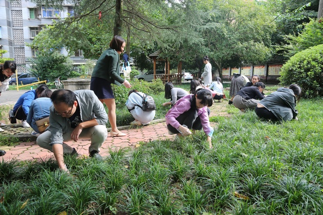 最后教师志愿者对社区的垃圾进行了卫生清理,着重将花园里影响居民通行和社区美观度的过道、台阶处杂草拔除。