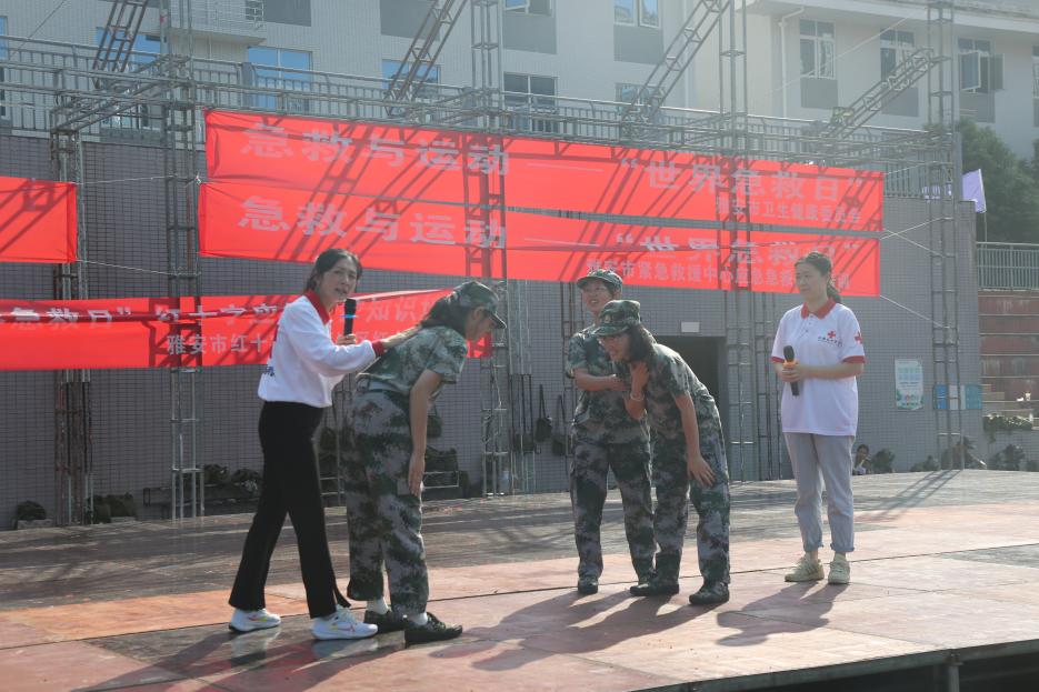 活动分为两个部分,第一部分是由雅安市紧急救援中心组建的专家团队带来的地震灾害情境后的医学救援演练,第二部分由雅安市紧急救援中心杨明菁导师、中国人民解放军后勤保障第九四五医院李龙医师、中国红十字应急救护培训团队、太阳集团tyc33455专业教师黄丹、伍静薇以及志愿者团队为大家现场分享如何拨打120、心肺复苏及AED的使用技术和气道异物梗阻处理技术。